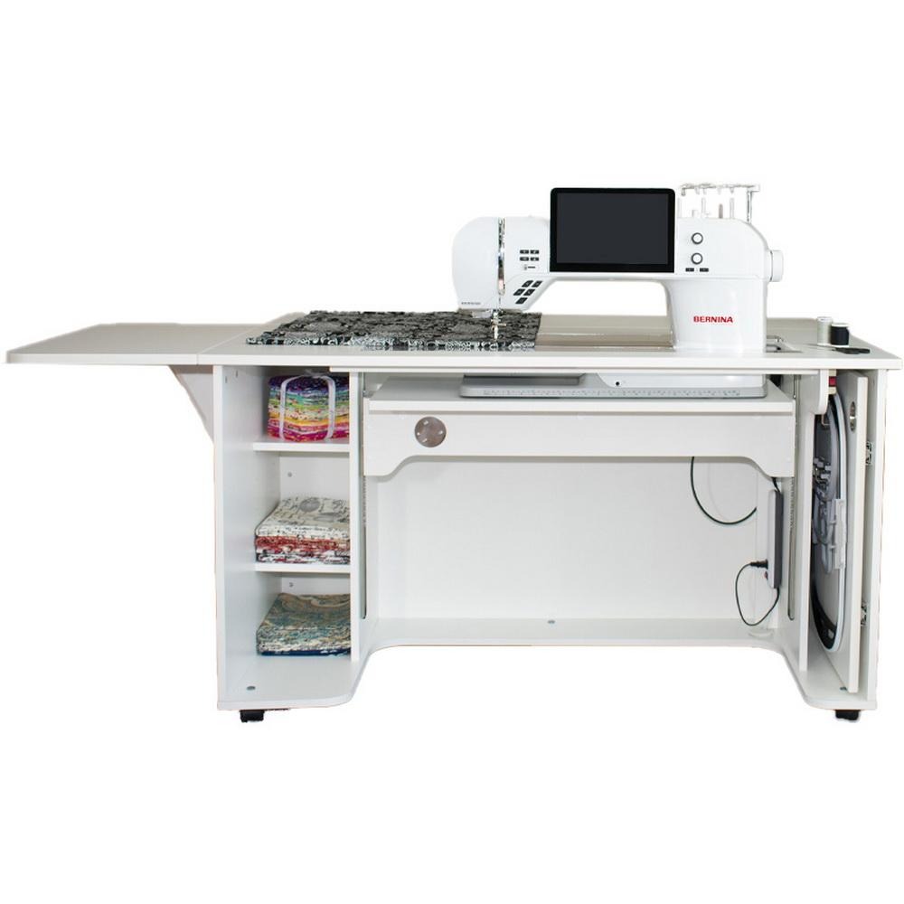 The NEW Model 9030 is the ultimate space-saving solution for those needing a cabinet that fits today’s largest sewing machines. Designed with efficiency in mind, it features adjustable shelving and dedicated storage for embroidery hoops. The rear drop leaf and left-side swing-up table provide an expandable work surface for large projects. Plus, you get more leg and knee room than ever before in a compact cabinet.