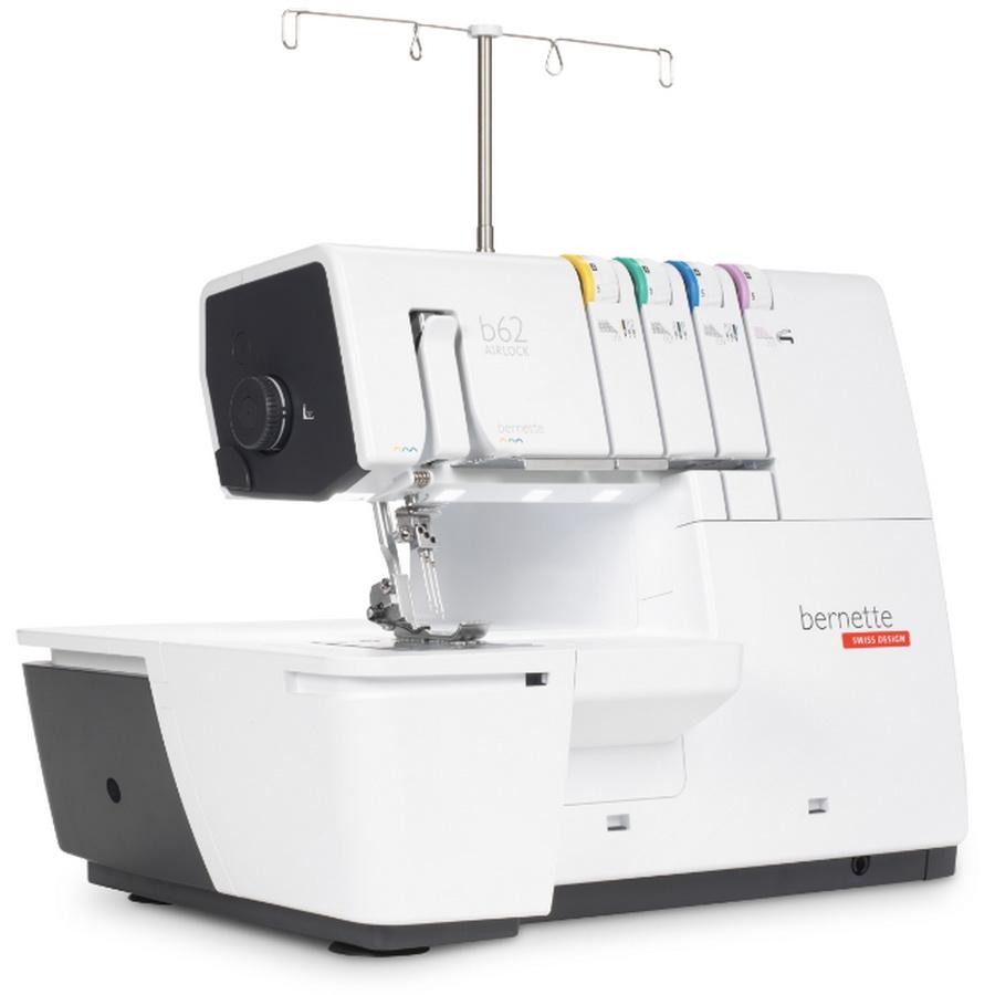 The Bernette 62 AIRLOCK is part of the b60 series and excels as a coverstitch machine. Its automatic air threader makes threading the looper effortless. With 4 coverstitches and 3 chainstitches, it handles a variety of fabrics – especially stretchy fabrics – perfectly. The presser foot can be lowered and temporarily raised with the knee lifter, keeping both hands free to guide your fabric. The slide-on table and coverstitch insert expand the working area for large projects, while 5 bright LEDs illuminate the workspace clearly.