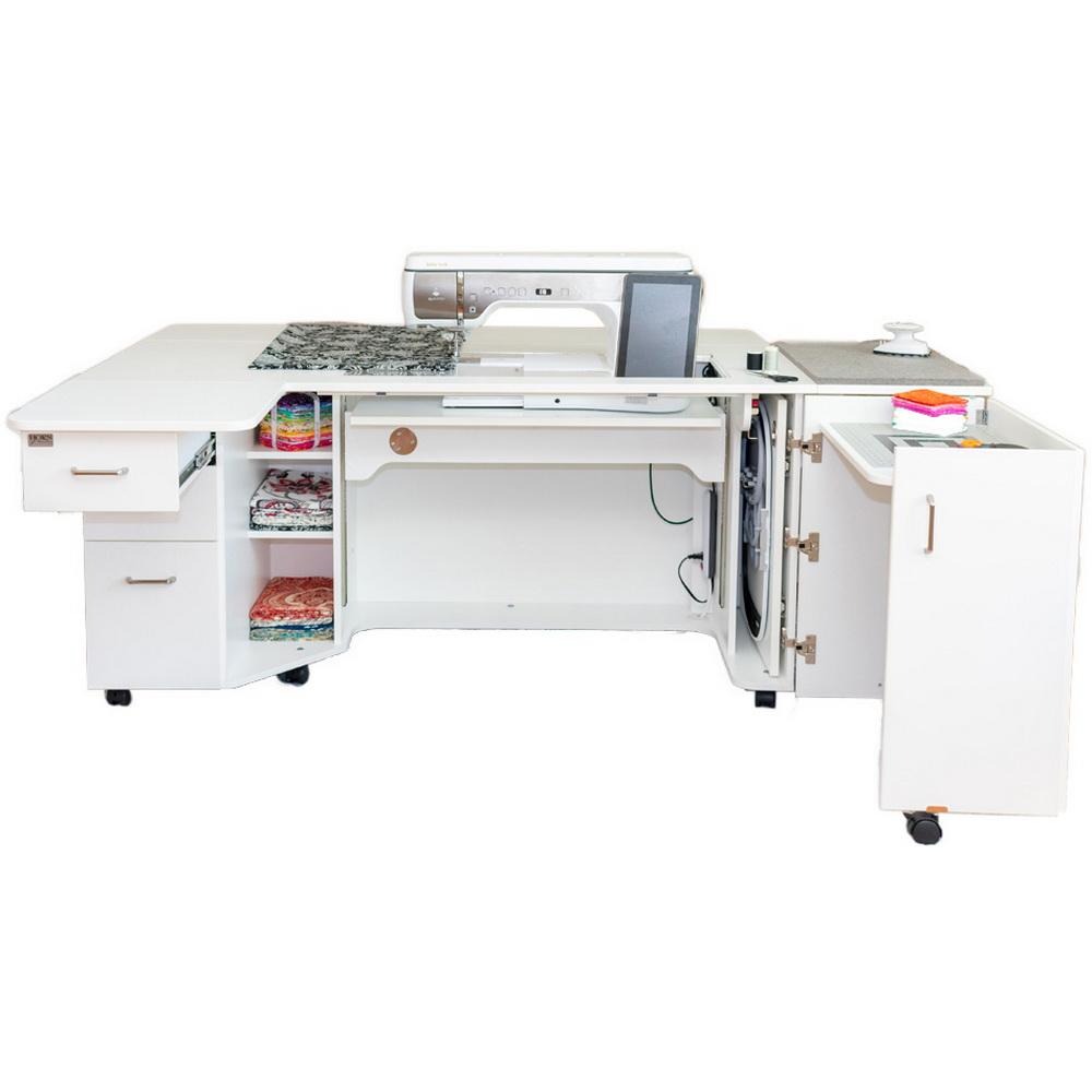Loading... Please wait...The NEW Model 9090 Sewing Cabinet is the ultimate sewing center, designed to offer a convenient and expandable work surface for all your sewing needs. It provides easy access to your tools and materials, keeping everything within reach for maximum efficiency. The spacious swing-up table can comfortably accommodate a sewing machine or serger (up to 45 lbs), a pressing mat, or a cutting mat. With everything organized in one location, the Model 9090 makes sewing easier and more enjoyable.